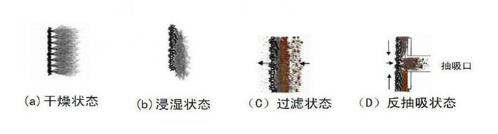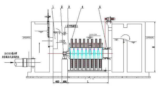 一、纖維轉(zhuǎn)盤濾池|纖維轉(zhuǎn)盤過濾器概述 纖維轉(zhuǎn)盤濾池|纖維轉(zhuǎn)盤過濾器是我公司自主研發(fā)的一項(xiàng)過濾技術(shù)。其主要原理是,當(dāng)污水進(jìn)入反應(yīng)槽后,轉(zhuǎn)盤交替地和空氣與污水相互接觸。在經(jīng)歷過一段時(shí)間后,在轉(zhuǎn)盤上即將附著一層棲息著大量生物的生物膜,微生物的種屬組成逐漸穩(wěn)定,其新陳代謝功能也逐步發(fā)揮出來,并逐漸達(dá)到穩(wěn)定的程度,污水中的有機(jī)物為生物膜所吸附和降解。 二、纖維轉(zhuǎn)盤的過濾介質(zhì) 纖維轉(zhuǎn)盤濾池|纖維轉(zhuǎn)盤過濾器的過濾質(zhì)是纖維毛濾布,它的主要成分是有機(jī)纖維堆,其絨毛表面由50%超細(xì)聚酯纖維和50%改性丙烯晴纖維堆組成,同時(shí)以聚酯纖維作為支撐體。在干燥狀態(tài)下,纖維毛呈直立狀態(tài),浸濕后纖維毛便會(huì)耷拉下來,形成濾布介質(zhì)有3-5mm的有效過濾深度,且當(dāng)量孔徑只有10μm ,可以使固體粒子在有效過濾厚度中與過濾介質(zhì)充分接觸,在反沖洗狀態(tài)下,與反抽裝置相靠近的纖維毛又會(huì)直立起來,方便纖維毛中的雜質(zhì)排出,可以徹底清洗。纖維毛在各種狀態(tài)下的情況如圖所示: 三、纖維轉(zhuǎn)盤濾池|纖維轉(zhuǎn)盤過濾器的結(jié)構(gòu) 纖維轉(zhuǎn)盤濾池|纖維轉(zhuǎn)盤過濾器結(jié)構(gòu)如下圖所示,它由用于支撐濾布的垂直安裝于中央集水管的平行過濾轉(zhuǎn)盤串聯(lián)起來組成。一套裝置過濾轉(zhuǎn)盤數(shù)量-般為2-20個(gè) ,每個(gè)過濾轉(zhuǎn)盤是由6個(gè)小塊扇形組合而成。過濾轉(zhuǎn)盤由防腐材料組成, 每片過濾轉(zhuǎn)盤外包有纖維毛濾布。反沖洗裝置反抽吸裝置及閥門組成。排泥裝置由排泥管、排泥泵及閥門]組成,排泥泵與反洗水泵為同一泵。 四、纖維轉(zhuǎn)盤濾池|纖維轉(zhuǎn)盤過濾器的運(yùn)行 纖維轉(zhuǎn)盤濾池|纖維轉(zhuǎn)盤過濾器的運(yùn)行狀態(tài)包括:過濾、反沖洗、排泥狀態(tài)。 (1)過濾:外進(jìn)內(nèi)出,污水重力流進(jìn)入濾機(jī)體,使濾盤全部浸沒在污水中。同時(shí)為了使各處布水均勻并且使進(jìn)水量產(chǎn)生低擾動(dòng),須在濾機(jī)中設(shè)布水堰。污水通過濾布過濾,過濾液通過中空管收集后, 流入出水槽、堰排出濾機(jī)。整個(gè)運(yùn)行過程中過濾均為連續(xù)的,即便在清洗過程中,過濾仍在進(jìn)行。 (2)清洗:過濾中部分污泥吸附于纖維毛濾布中,逐漸成為污泥層。隨著濾布上污泥的積聚,濾布過濾阻力增加, 濾池水位逐漸升高。通過設(shè)置在濾池內(nèi)的液位傳感器監(jiān)測(cè)池內(nèi)的液位變化,當(dāng)該池內(nèi)液位到達(dá)清洗設(shè)定值時(shí)(高水位),控制盤即啟動(dòng)反沖洗泵,同時(shí)啟動(dòng)濾盤旋轉(zhuǎn),開始清洗過程。反洗時(shí)間和周期可以調(diào)整。 (3)排泥:纖維轉(zhuǎn)盤濾池|纖維轉(zhuǎn)盤過濾器轉(zhuǎn)盤下設(shè)有斗型池底,有利于池底污泥收集。池底污泥沉積減少了濾布上的污泥量,可延長過濾時(shí)間,減少反沖洗水量。經(jīng)過一設(shè)定的時(shí)間段,控制盤啟動(dòng)排泥泵,通過池底穿孔排泥管、閥、泵將污泥排至污泥系統(tǒng)。其中,排泥間隔時(shí)間及排泥歷時(shí)可以調(diào)整。 五、纖維轉(zhuǎn)盤濾池|纖維轉(zhuǎn)盤過濾器的獨(dú)特設(shè)計(jì)和優(yōu)點(diǎn): (1)出水水質(zhì)好,耐沖擊負(fù)荷高; 纖維轉(zhuǎn)盤濾池|纖維轉(zhuǎn)盤過濾器截留效果好,在進(jìn)水SS不大于20mg/l時(shí),出水SS可以小于5mg/l。 (2)占地面積; 與傳統(tǒng)的深層過濾單元不同的是:傳統(tǒng)過濾設(shè)備內(nèi)水流一般從上至下,或從下至上,屬于平面方向過濾,纖維轉(zhuǎn)盤過濾器則將過濾面豎直起來,水流從左至右流動(dòng),因此很多過濾面可以并排布置,可以在保證過濾面積足夠大的前提下減少占地面積。另外,設(shè)備簡(jiǎn)單緊湊,附屬設(shè)備少,根據(jù)布置情況,附屬設(shè)備只需占用少量地方。 (3)設(shè)備閑置率低,總裝功率低; 所有濾盤幾乎總處于過濾狀態(tài),設(shè)備閑置率低。整個(gè)過濾裝置需要用電的只有驅(qū)動(dòng)電機(jī)、反洗水泵和電動(dòng)閥,驅(qū)動(dòng)電機(jī)功率僅為0.55KW-0.75KW,反洗水泵功率僅為2.2KW,總裝機(jī)功率很低 (4)反沖洗量水少,對(duì)前面處理工藝影響; 纖維轉(zhuǎn)盤過濾器所需要的水量小,與處理水量的比為≤1%。實(shí)際工程運(yùn)行情況下,反沖洗間隔時(shí)間一般為2h,每個(gè)濾盤的沖洗時(shí)間為1-2mim。因此,反洗水量可以比較均勻地返回到處理前處理系統(tǒng),不會(huì)對(duì)前處理工藝產(chǎn)生影響。 (5)清洗徹底,無需預(yù)加氯; 濾布結(jié)構(gòu)為大孔隙支撐層及纖維毛層,反抽吸時(shí),在反抽吸口處纖維毛會(huì)完全直立起來,清洗比較徹底,殘留很難積累。 (6 )運(yùn)行自動(dòng)化; 整個(gè)過程用計(jì)算機(jī)控制,可根據(jù)液位或時(shí)間來控制反沖洗過程及排泥過程的時(shí)間間隔及過程歷時(shí)。 ( 7 )維護(hù)簡(jiǎn)單方便; 纖維轉(zhuǎn)盤濾池|纖維轉(zhuǎn)盤過濾器只有反沖洗或排泥時(shí),泵或電機(jī)才運(yùn)轉(zhuǎn)。濾布磨損較小,即使有異常損壞,濾盤也易于更換,濾盤的每個(gè)扇形片均可以單獨(dú)移開,更換一個(gè)盤片僅需