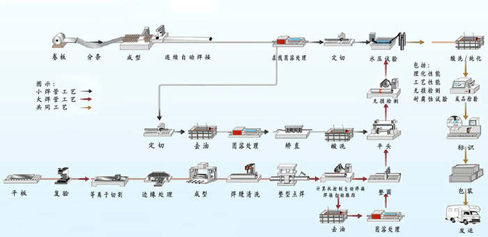 公司擁有國內(nèi)先進(jìn)制管流水線6條。從分條開卷、清洗脫脂、緄軋成型、焊接、打磨、定徑、在線固熔、渦流探傷、標(biāo)志噴碼、定尺檢驗(yàn)、氣密性試驗(yàn)、檢驗(yàn)包裝,都嚴(yán)格按照GB/T12771-2000《流體輸送用不銹鋼焊接鋼管》、ASTM A249/A249M-96a《鍋爐、過熱器、熱交換器及冷凝器用奧氏體焊接鋼管》、SA-249/SA-249M《鍋爐、過熱器、換熱器和冷凝器用焊接奧氏體鋼管子》執(zhí)行。公司專業(yè)生產(chǎn)的管徑12mm-76mm,壁厚0.2mm-3.0mm的不銹鋼氬弧焊管,廣泛用于電力、化工、機(jī)械等行業(yè);特別對電力行業(yè)的凝汽器改造用的高效不銹鋼管的生產(chǎn)、安裝有著豐富的經(jīng)驗(yàn)和能力。