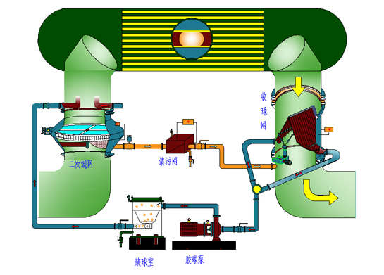 二、中央空調(diào)膠球清洗裝置使用范圍 中央空調(diào)膠球清洗裝置漏斗式收球網(wǎng)主要適用于中央空調(diào)主機(jī)[冷凝器|蒸發(fā)器]冷卻水管的清洗,還適用于各種熱交換器冷卻管的清洗,大大提高了熱交換效果,還提高了有效的經(jīng)濟(jì)效益。對(duì)于小型發(fā)電機(jī)組通常采用單流程清洗系統(tǒng)。 使用膠球清洗裝置可在機(jī)組不減負(fù)荷的情況下清洗凝汽器冷卻水管,提高凝汽器的傳熱效果,防止汽輪機(jī)熱效率因背壓升高而降低,同時(shí)可防止冷卻管因結(jié)垢而腐蝕,延長冷卻管的使用壽命,是節(jié)能和改善勞動(dòng)條件的理想設(shè)備。